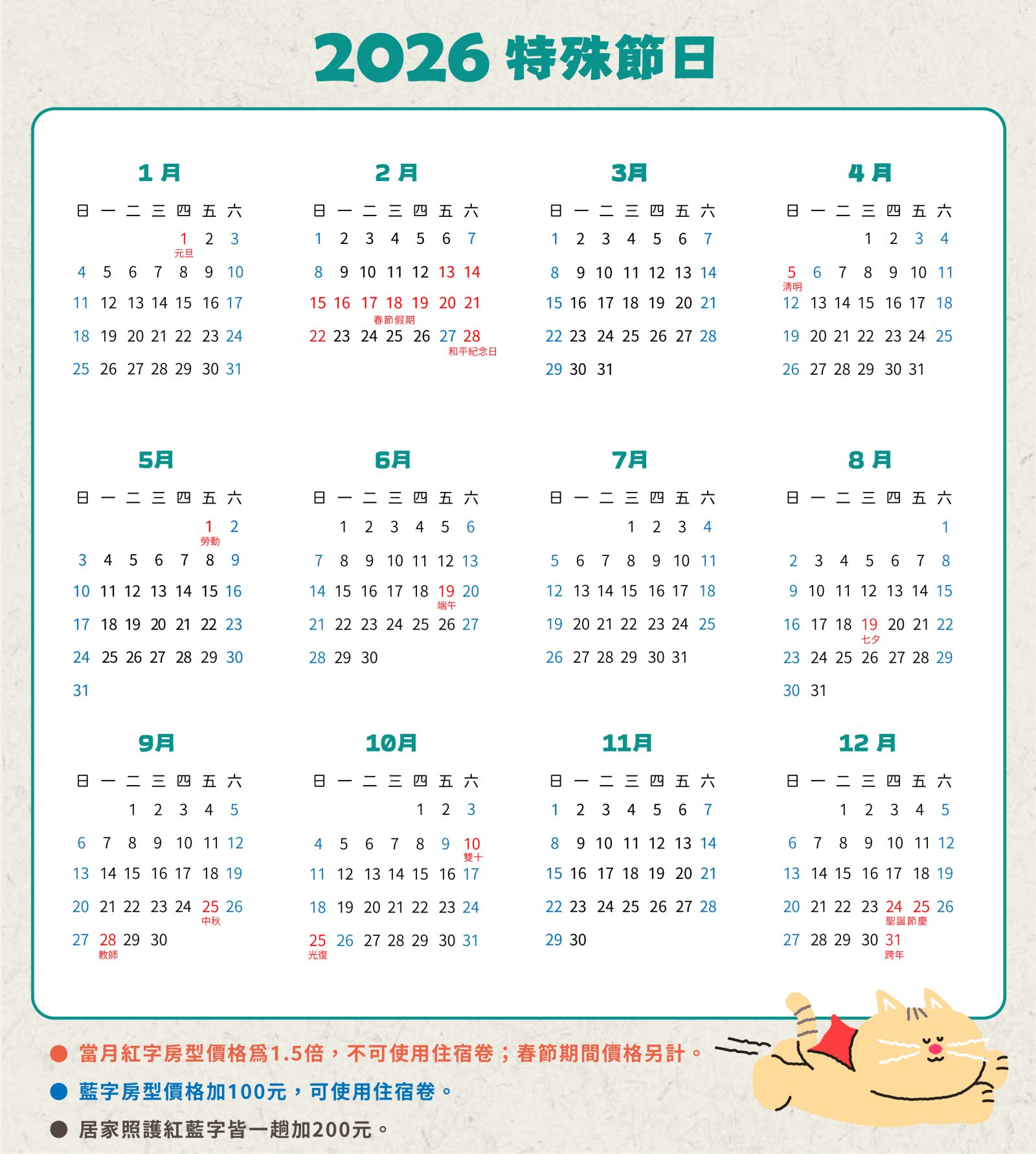 ‧ 住宿卷不包含加貓費及假日費用;六日加收100元,加貓費200元。